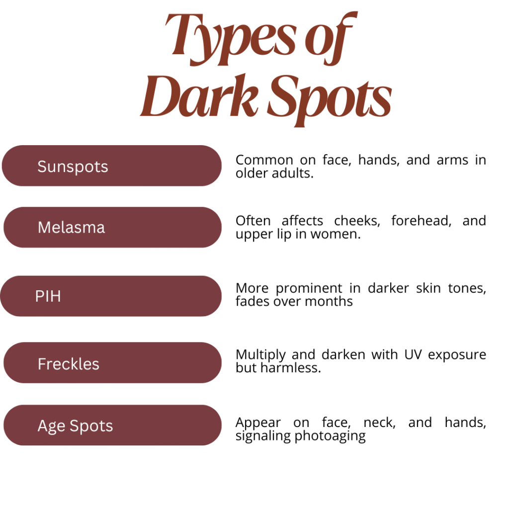 Skin Pigmentation Concern Dark spots, also known as hyperpigmentation, are areas of skin that appear darker than the surrounding tone due to excess melanin production.
