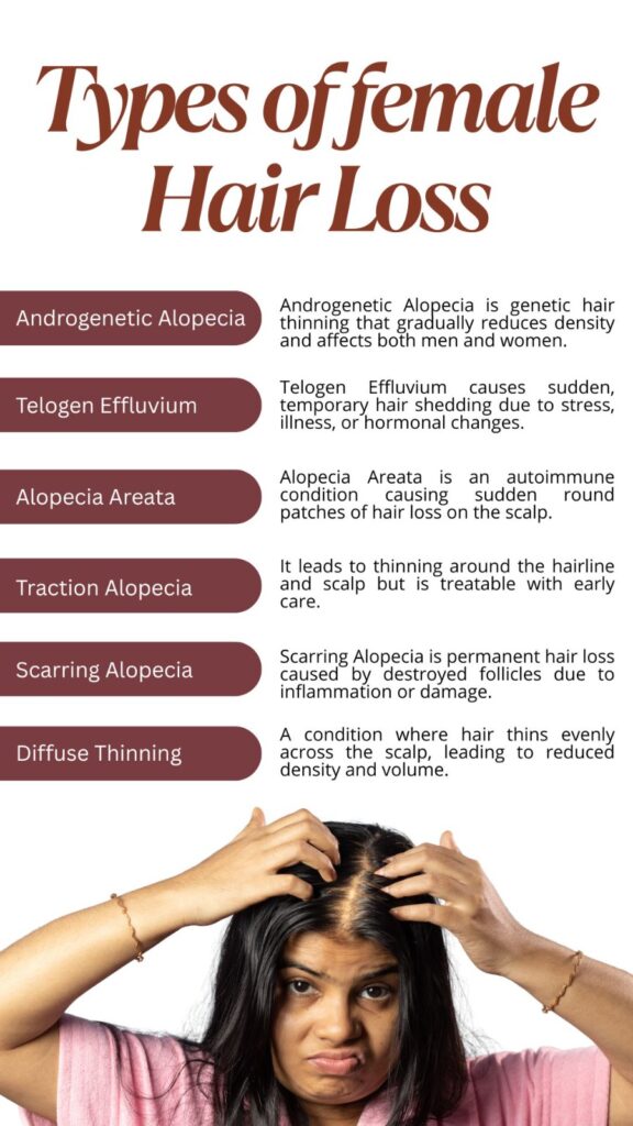 Female hair loss is caused by hormonal changes, genetics, and aging, which weaken hair follicles and slow growth. Other factors like stress, nutritional deficiencies, thyroid disorders, pregnancy, menopause, and harsh styling practices also contribute. Poor diet and scalp health further accelerate hair thinning and excessive shedding over time