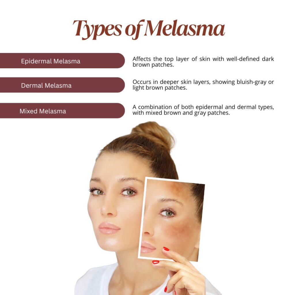 Melasma appears in three main types: epidermal, affecting the outer skin with brown patches; dermal, deeper in the skin with bluish-grey pigmentation; and mixed, involving both layers with brown-grey patches. Treatment depends on the type and may include topical creams, chemical peels, and laser therapies for effective and long-lasting results.