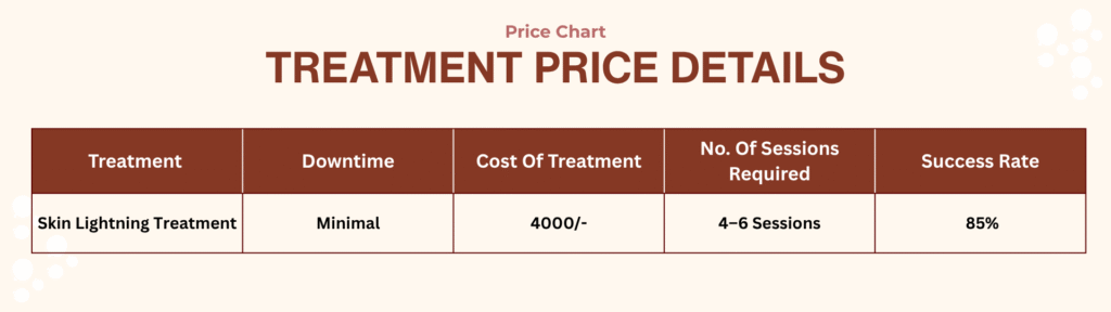 It’s important to note that the cost may vary depending on various factors, such as the clinic’s location, the dermatologist’s or skin specialist’s reputation, and the type and number of sessions required for the treatment. It’s always advisable to consult with a qualified dermatologist or skin specialist before opting for any skin-lightening treatment to determine the best course of action and the associated costs.